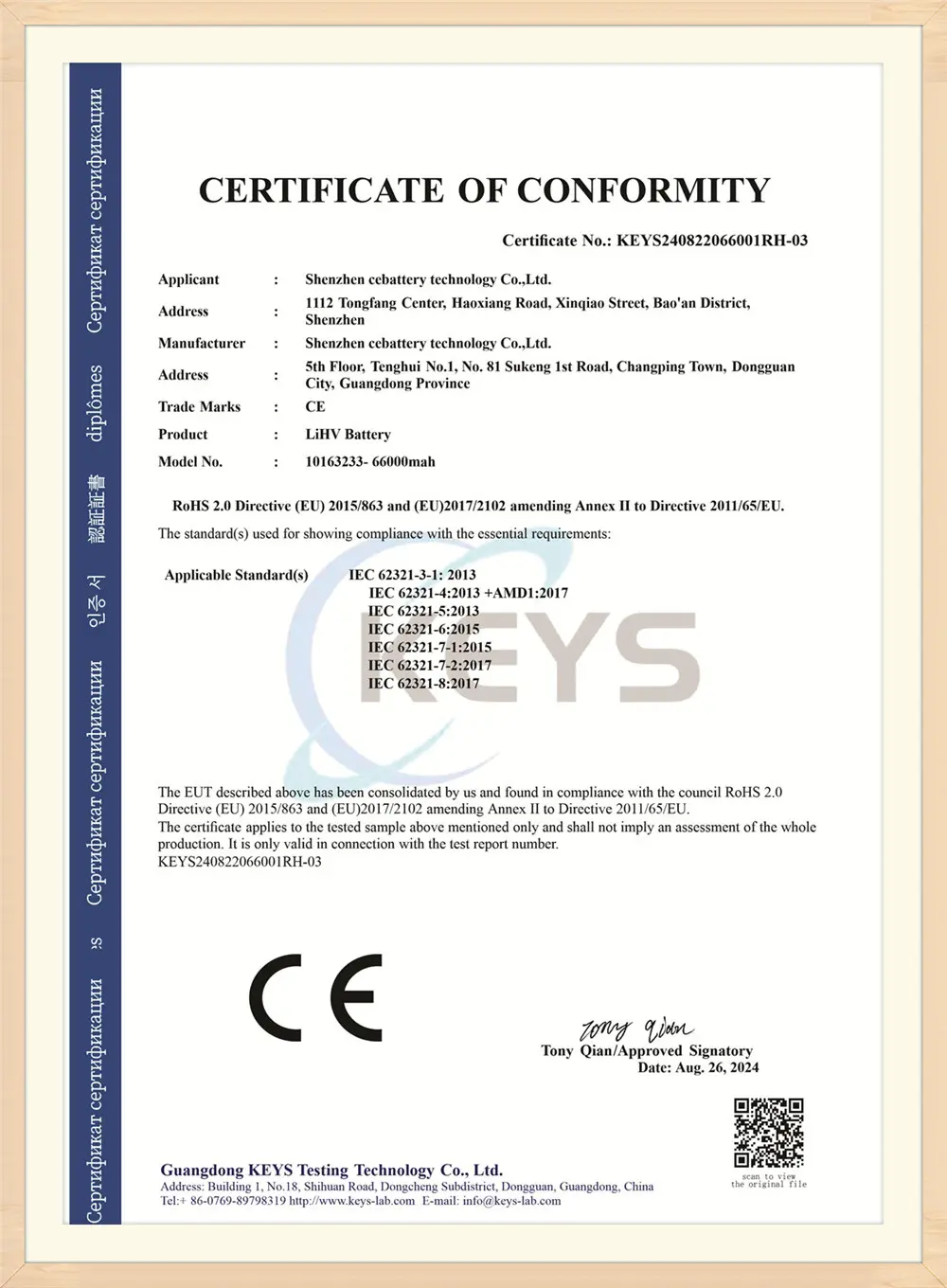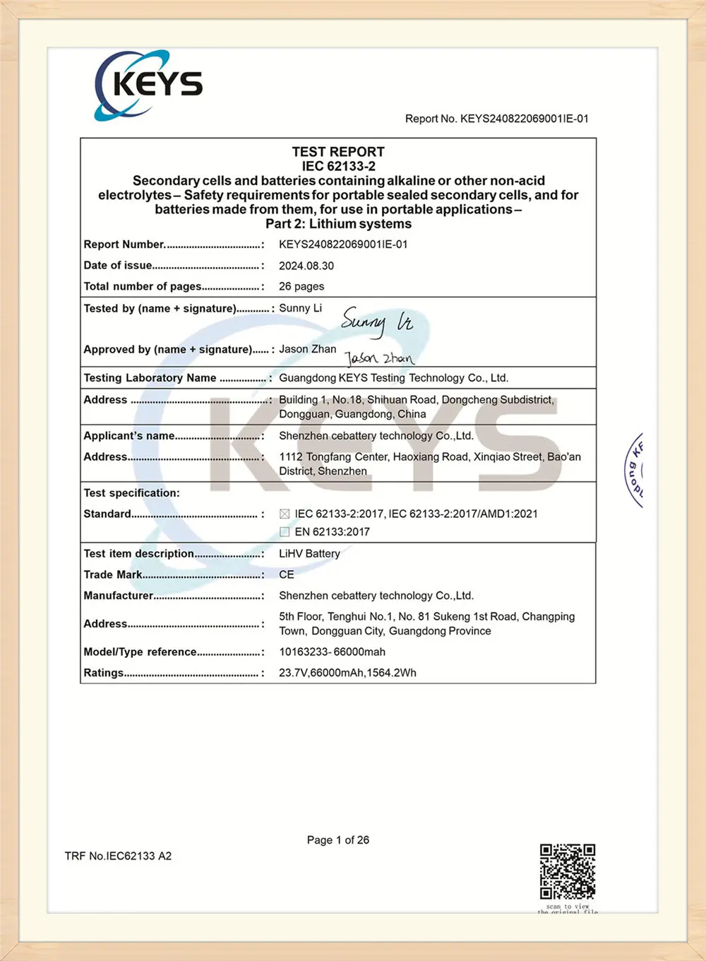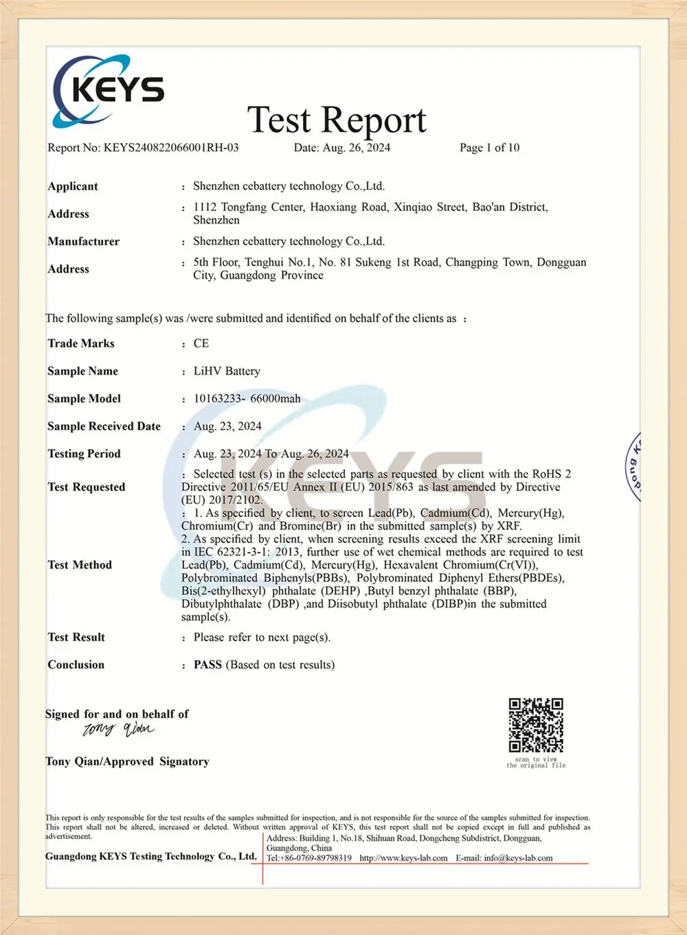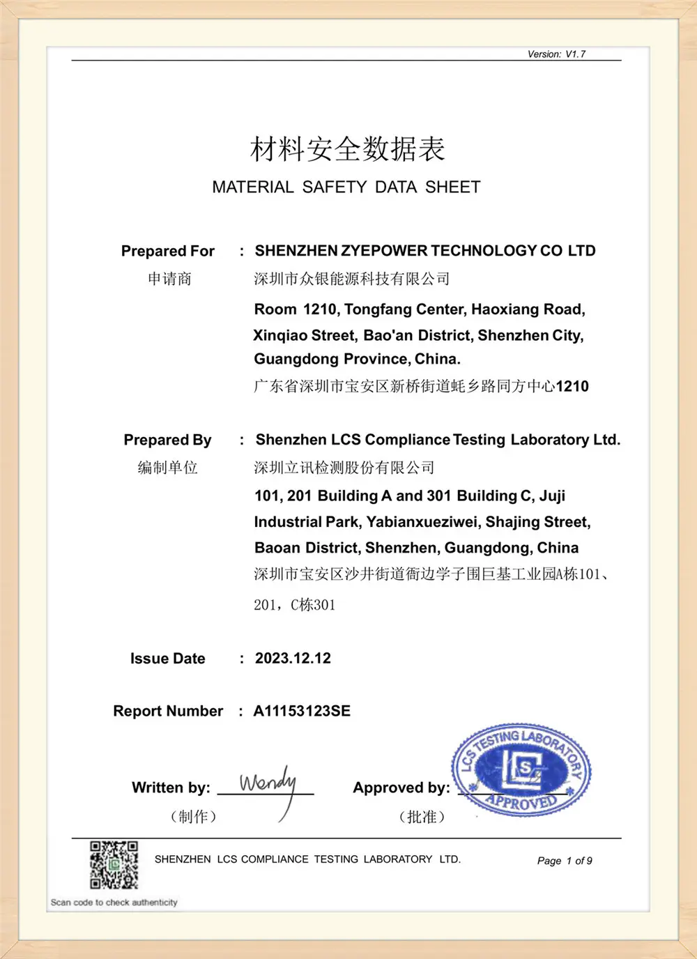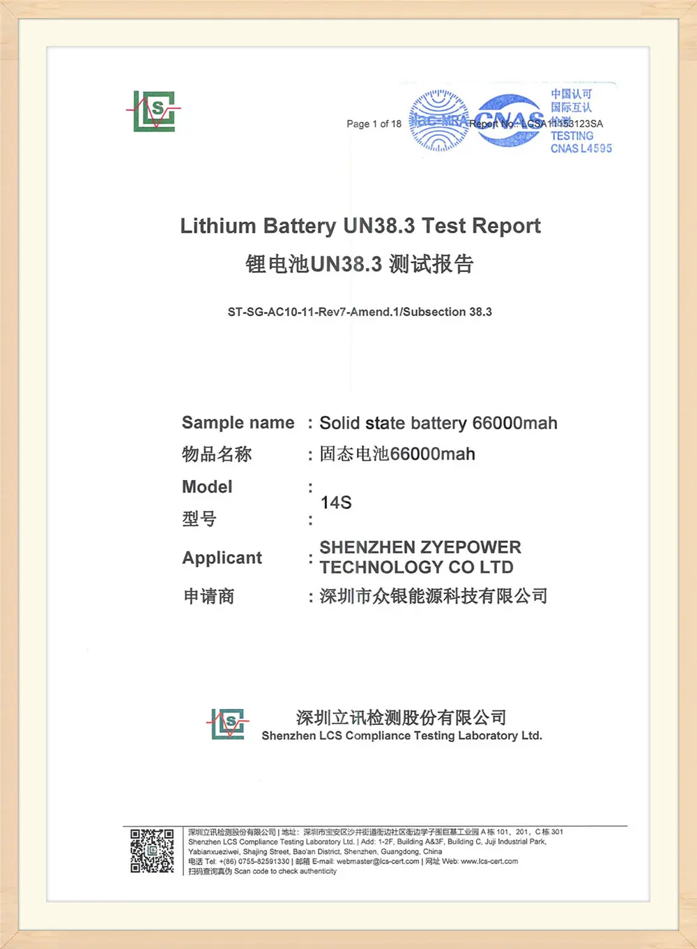 zyebatteyສະເຫມີປະຕິບັດການປັດຊະຍາທາງທຸລະກິດຂອງ "ຄຸນນະພາບທໍາອິດ, ການບໍລິການດ້ານການບໍລິການ, ຄວາມປອດໄພດ້ານການຮັກສາ". ເພື່ອເປັນຜູ້ສະຫນອງແບັດເຕີຣີທີ່ດີທີ່ສຸດແລະຫມັ້ນຄົງທີ່ສຸດ, ພວກເຮົາໄດ້ຜ່ານການອອກໃບຢັ້ງຢືນທີ່ມີຄຸນນະພາບສູງ, ເຊັ່ນວ່າ iso9001: 2015, CE, FCC, UN, 3C ແລະອື່ນໆ.